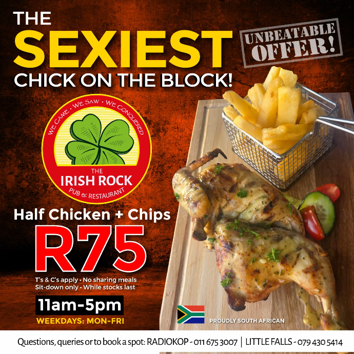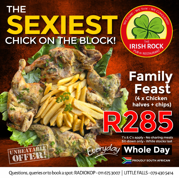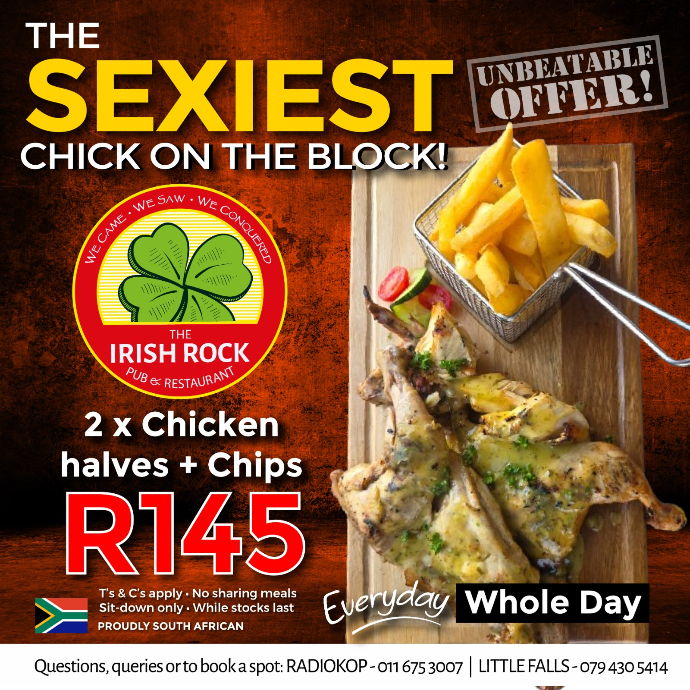 Feed the crew without breaking the bank: four chicken halves + chips for R285, all day, every day.